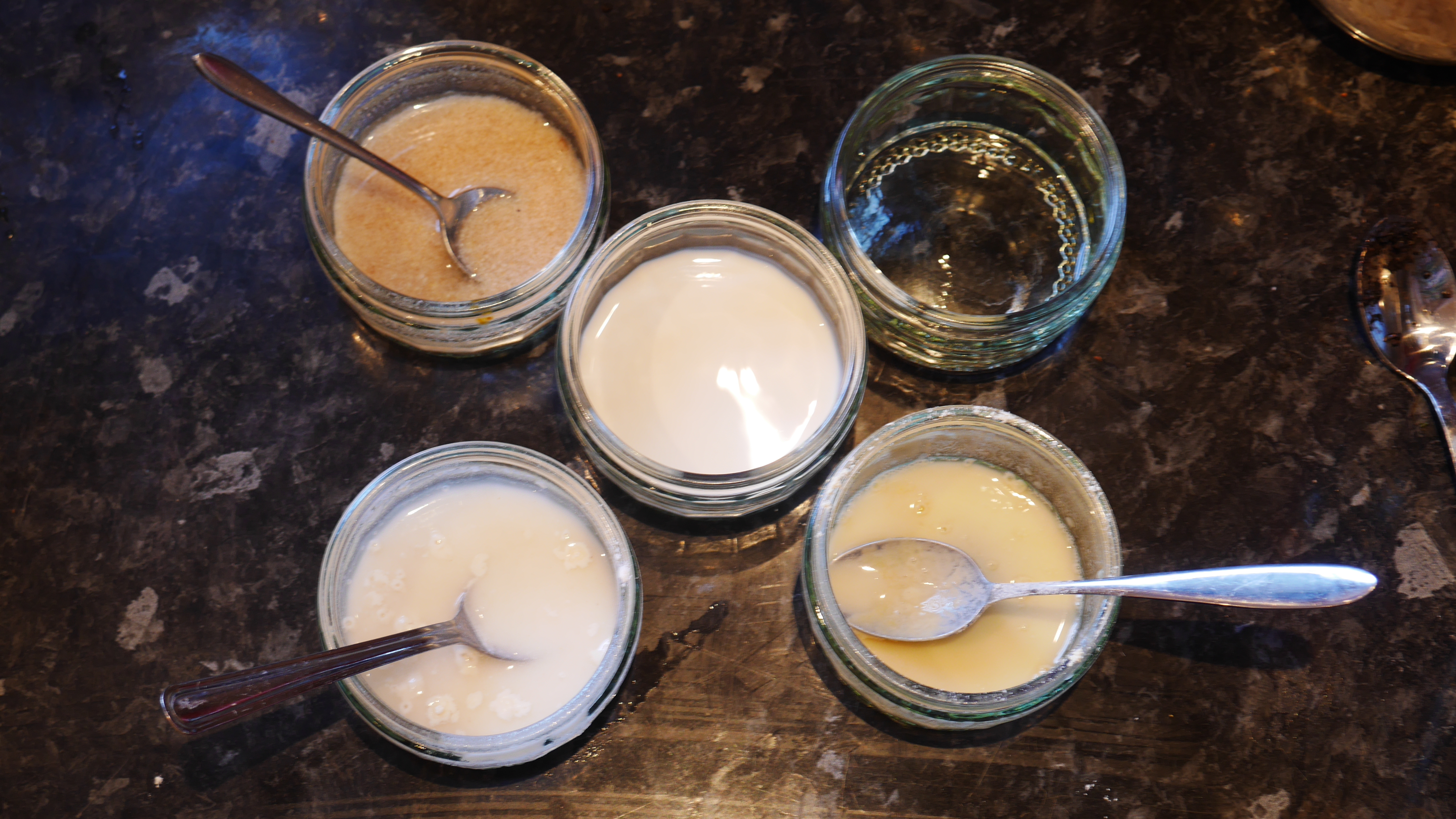Clockwise from top right: oil, chickpea flour, plain flour, flax egg. Middle: oat cream.
