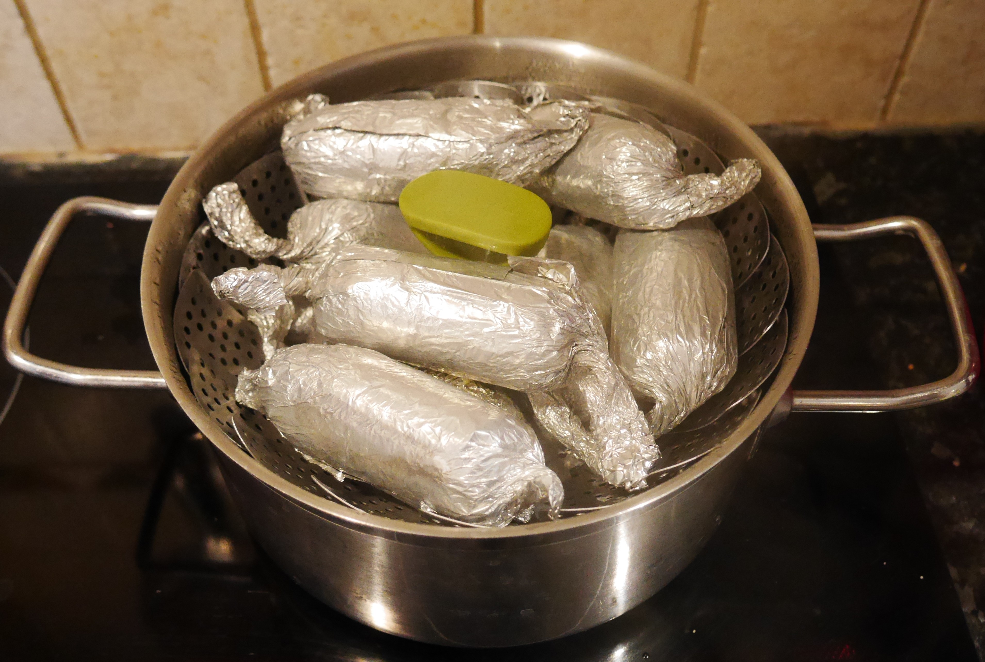 Foil wrapped seitan in the steamer