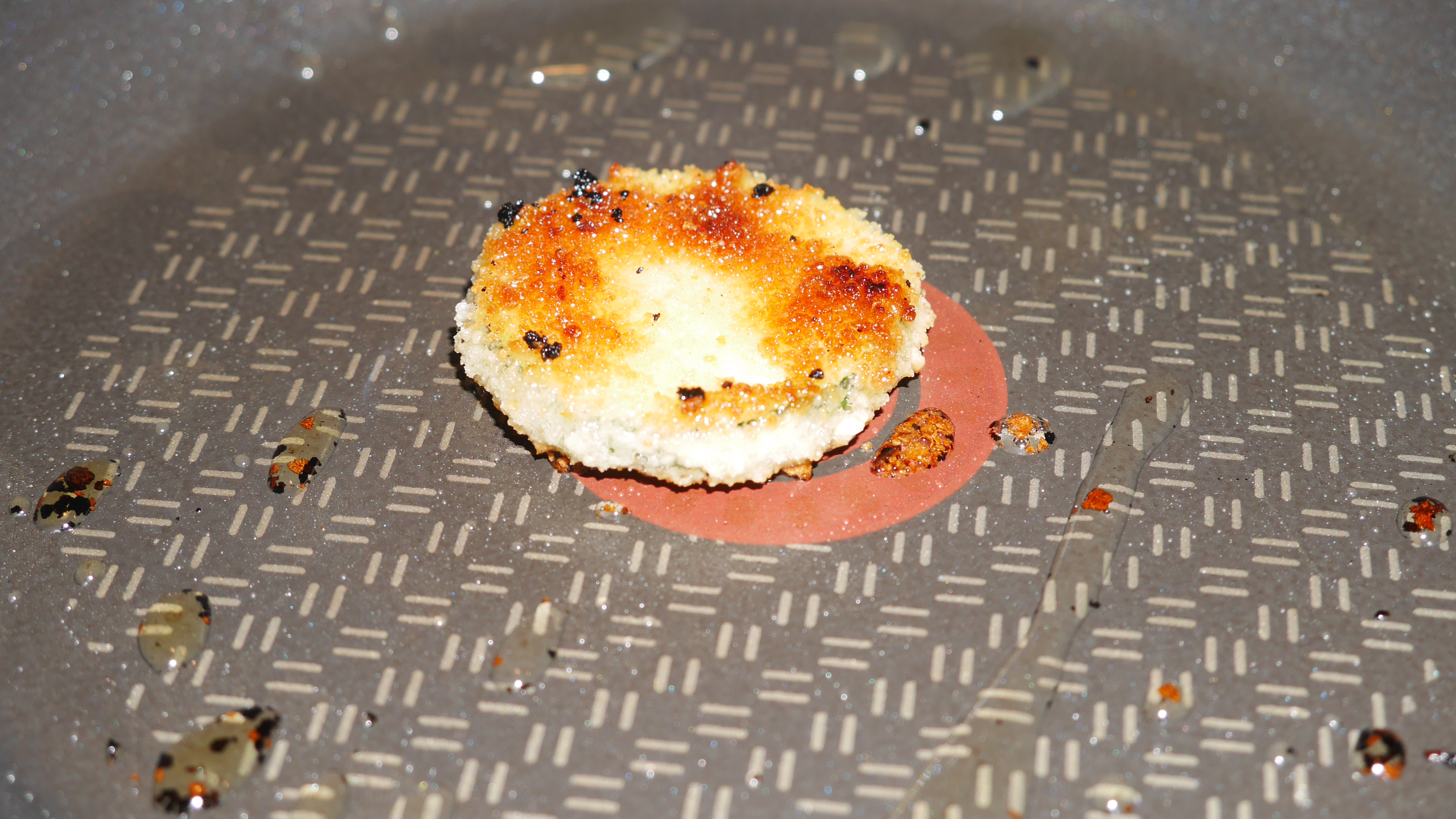 However, on introducing it to a hot pan, all the breadcrumbs came straight off and started burning into the pan. It’s a definite NO for oil.