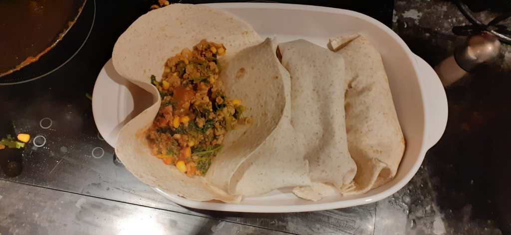 Get wraps out individually and place in dish, then fill with 1/4 of mixture each before carefully rolling and tucking edges under